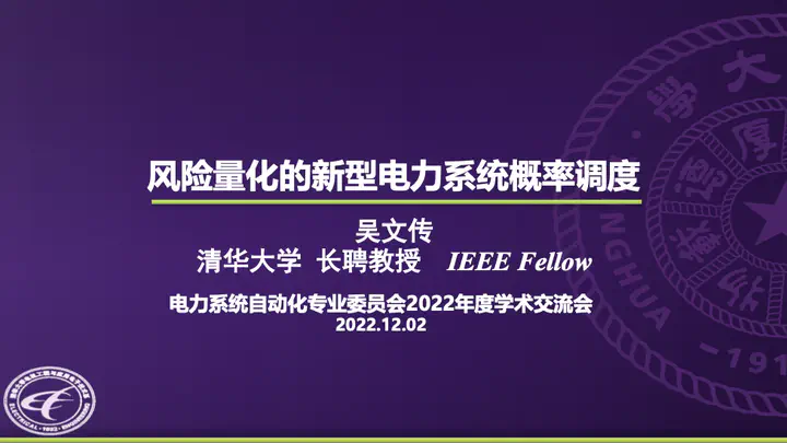 2022年12月2日,2022年中国电机工程学会年会分会场之一的中国电机工程学会电力系统自动化专业委员会2022年度学术交流会线上召开。吴文传在会上作了题为《风险量化的新型电力系统概率调度》的报告。